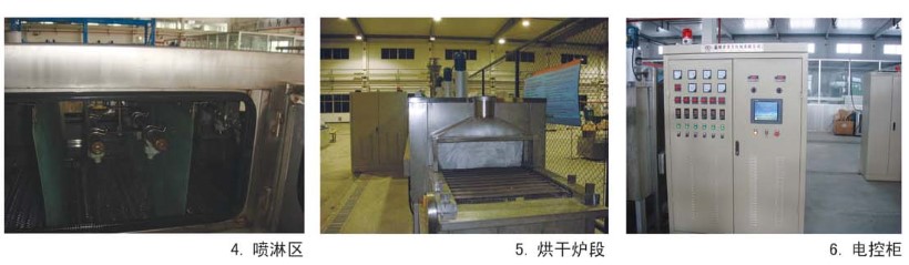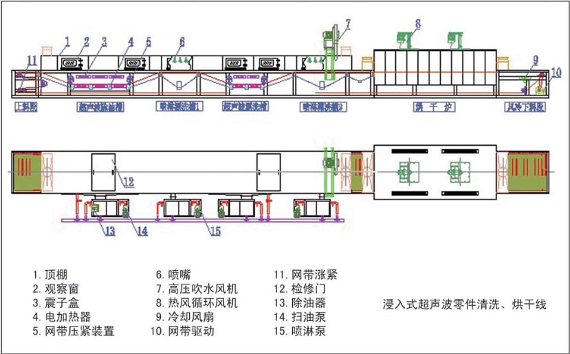 It is composed of frame, roof, ultrasonic degreasing tank, spray rinsing tank 1, ultrasonic rinsing tank, spray rinsing tank 2, circulating auxiliary tank and filtering system, oil-water separation system, high-pressure blower water system, drying furnace, air cooling system, transmission system, work basket, electrical control system, etc.