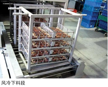 基本組成:由清洗段、過渡段、烘干爐段、風冷下料段、上料小車、 吊籃及電器控制系統(tǒng)組成。